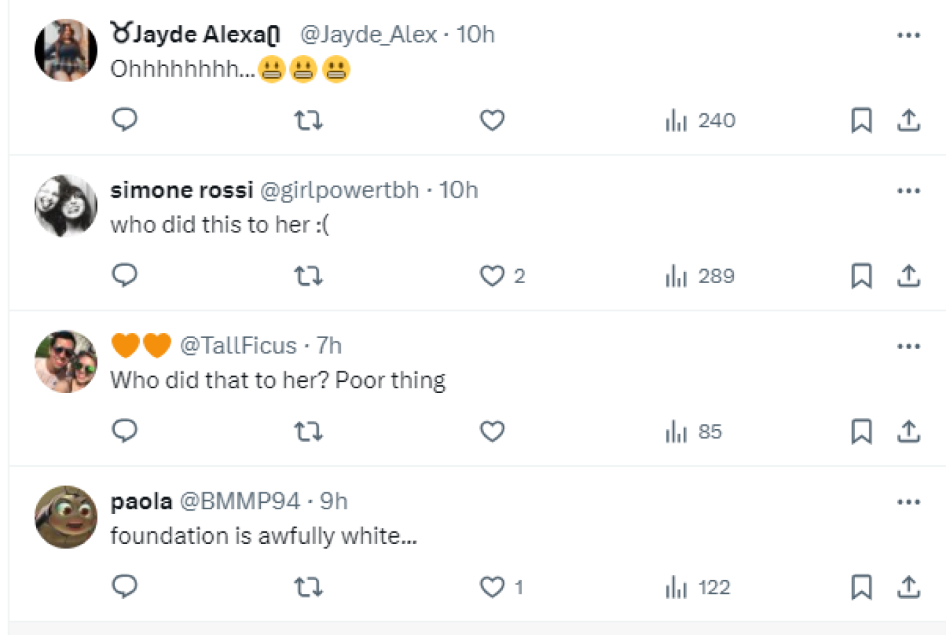 Në të njëjtën kohë, ata komentuan edhe zgjedhjen e saj të grimit, i cili nuk përputhej me ngjyrën e lëkurës së saj. “Kush ia bëri këtë ”, ka shkruar dikush, ndërsa një tjetër ka shtuar se ajo ka nevojë për miq të vërtetë për t’i thënë se ajo që i ka bërë në fytyrë është e keqe.