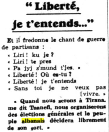 “Paris-presse” ka botuar, të mërkurën e 18 marsit 1953, në faqen n°5, një shkrim në lidhje me intervistën ekskluzive me udhëheqësin e partizanëve shqiptarë Apostol Tanefin dhe planet e tij për të rrëzuar Enver Hoxhën.