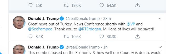Pas lajmit të armëpushimit, Trump ka shkruar në “Twitter”: “Lajm i shkëlyer nga Turqia. Konferenca për shtyp do të shtyhet. Faleminderit Erdogan. U shopëtuan miliona jetë njerëzish”, shkruan Trump.