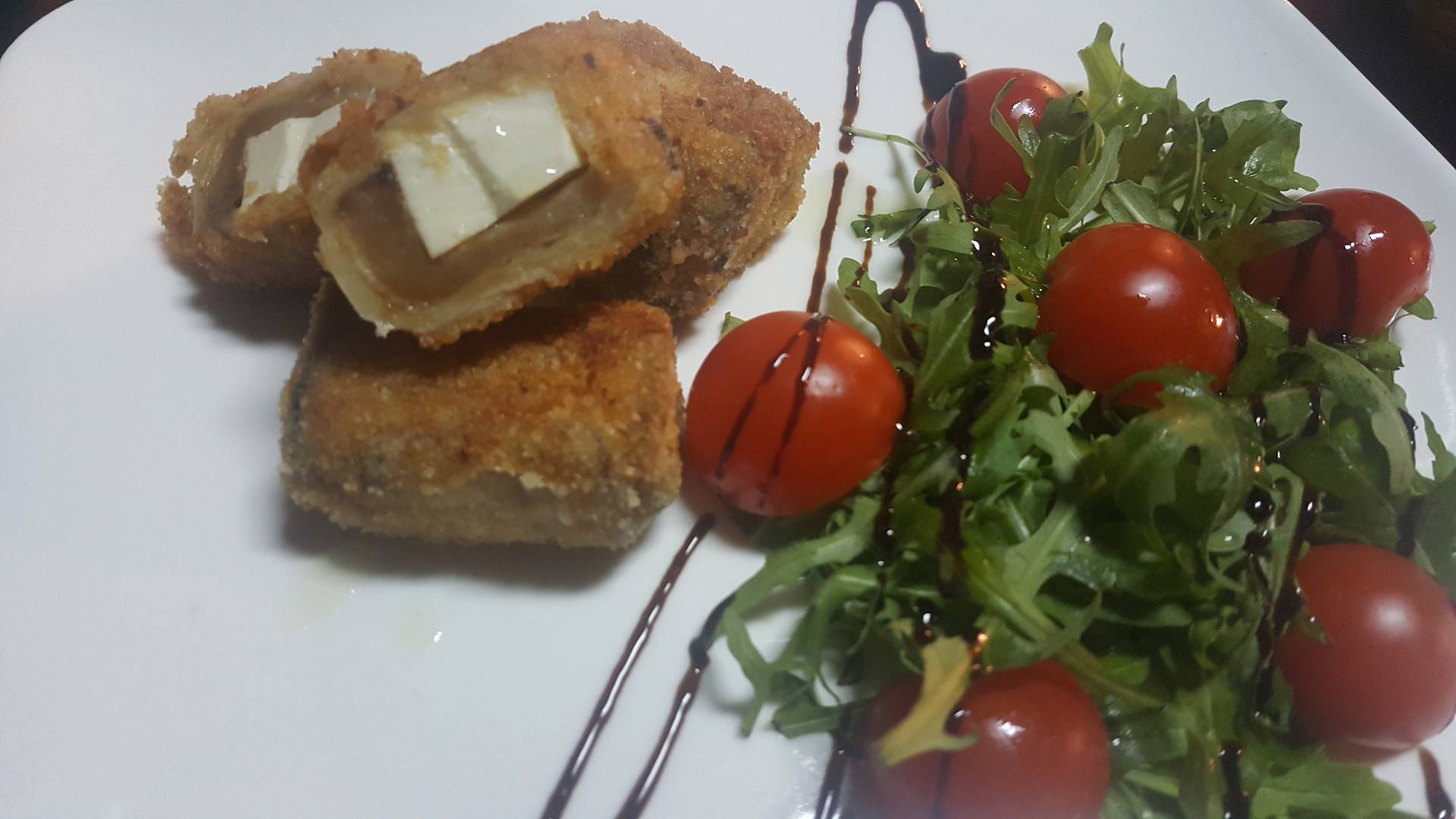 Në tre pjata vendosim miell, vezë dhe peksimadhe. Kalojmë roletë në miell duke i pudrosur mirë, i kalojmë në vezë dhe më pas në peksimadhe dhe i skuqim sa të zverdhen pak nga të gjitha anet. I servirim më pas patëllxhanët me djathë me rukola dhe domate ose me një sallatë tjetër sipas preferencave tuaja.