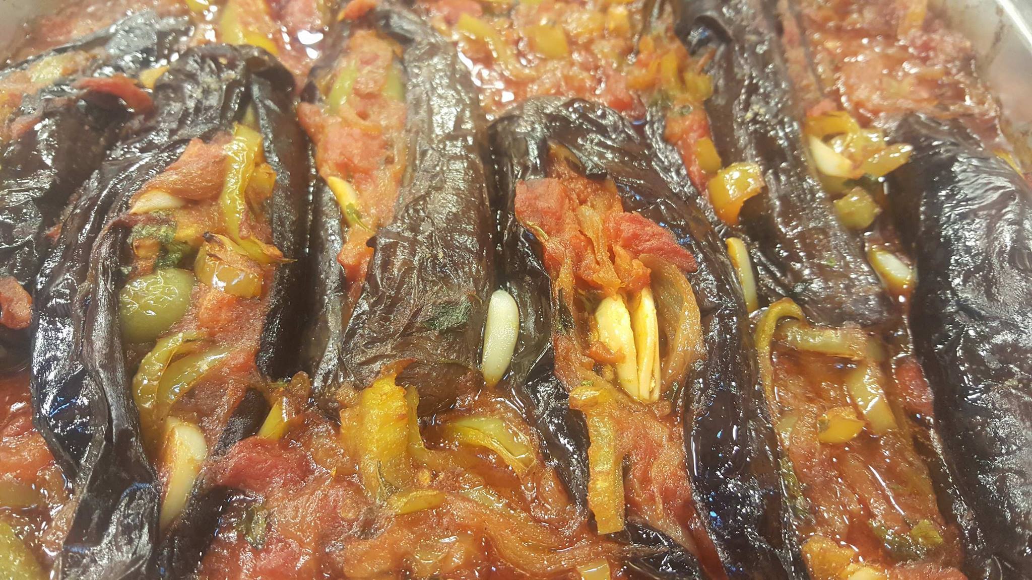 Fillimisht pastrojmë patëllxhanët, më pas i bëjmë vertikalisht patëllxhanëve 3 prerje për së gjati me një distancë mesatare duke krijuar 3 xhepa tek prerjet të cilat nuk i çojmë deri në fund. I spërkasim me pak kripë hapësirat që premë dhe i lemë të nxjerrin ujin për 15-20 minuta. Më pas i fshijmë, nëse dyshoi se keni hedhur shumë kripë, i shpëlajmë dhe më pas i thajmë mirë. Vendosim tiganin me vaj ulliri dhe skuqim lehtë patëllxhanët sa të zbuten pak dhe i vendosim në një pjatë. Në tiganin ku skuqëm patëllxhanët vendosim qepët të prera në feta dhe i lemë derisa të zverdhen pak duke i hedhur herë pas here nga një lugë ujë me qëllim që të zbutet mirë. Shtojmë specat dhe këta të prera në gjysëm rrethi në gjatësinë e qepës. I lemë pak dhe shtojmë domatet në kubikë mesatare së bashku me pak sheqer. I lemë domatet të ziejnë për 7 minuta dhe më pas shtojmë hudhrat të prera në feta për së gjati, majdanozin e grirë vrazhdë, kripën dhe piperin e zi. Me këtë masë mbushim hapësirat e patëllxhanëve duke i vendosur në një tavë. Nëse tepron pak mbushje e vendosim atë midis patëllxhanëve. E vendosim tavën në furrën e parangrohur në temperaturën 200 gradë Celsius për 30-40 minuta. Nëse shohim që po shteron lëngu mund të shtojmë 1 filxhan kafeje ujë.
