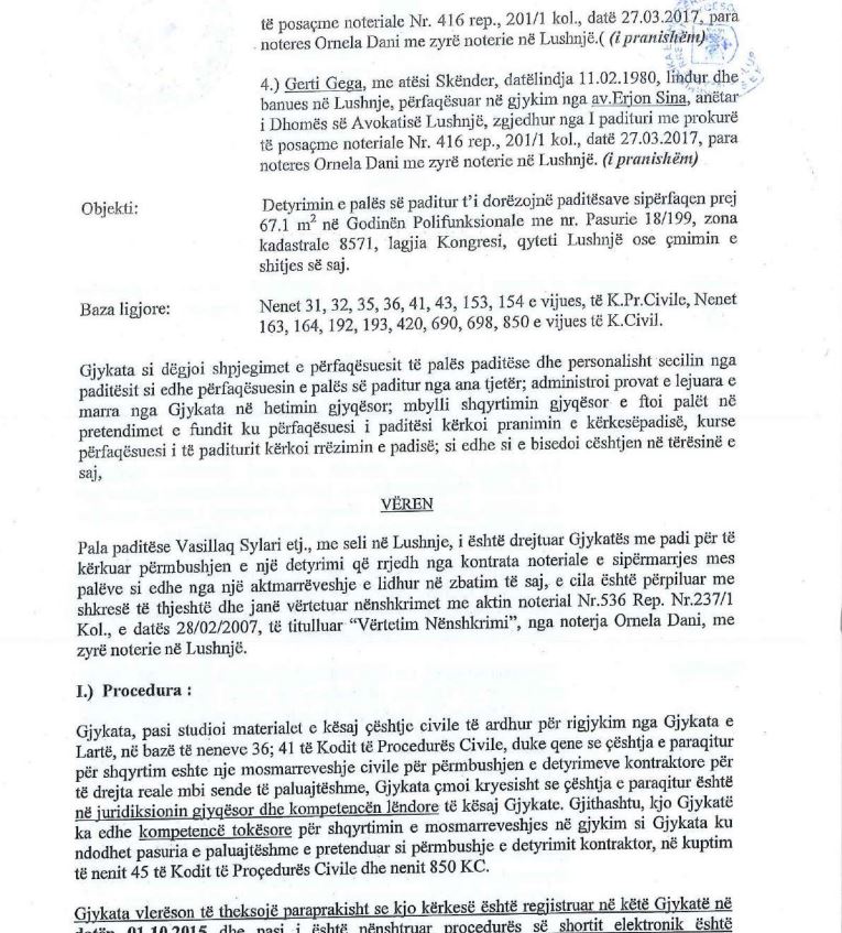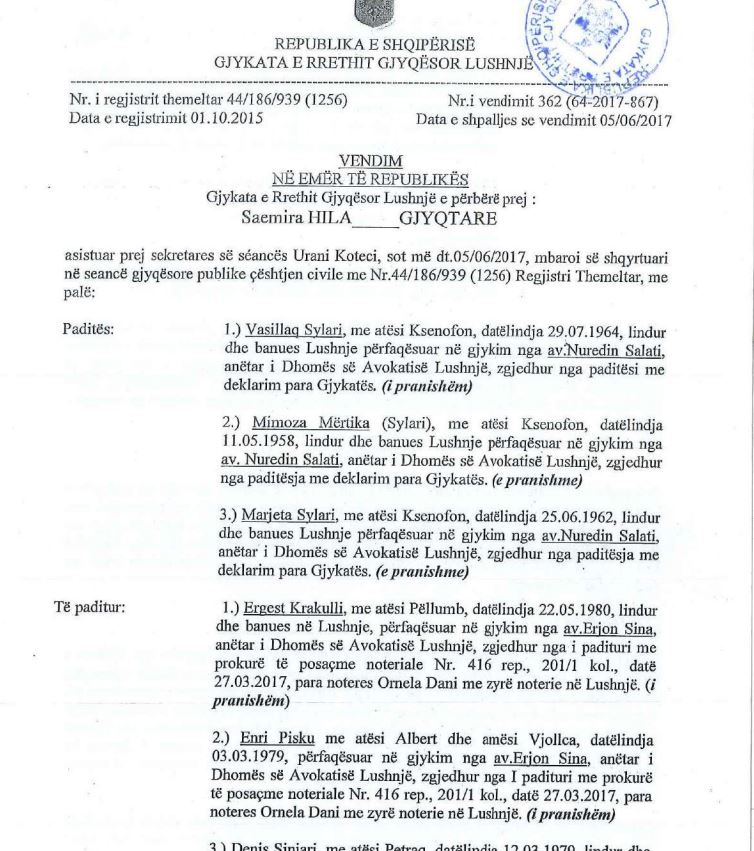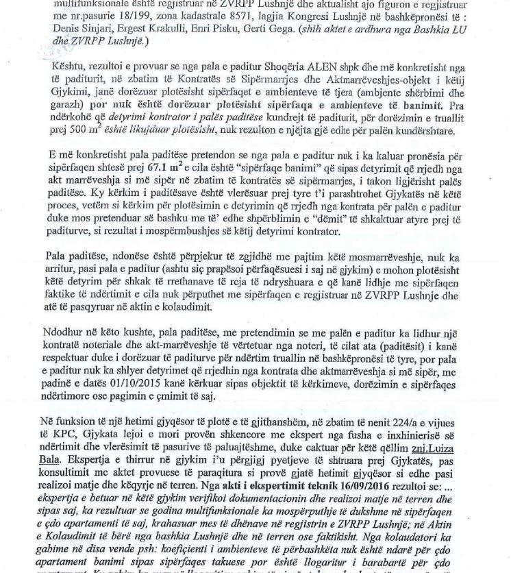 Për këtë ata paditën në gjykatë sipërmarrësin dhe Gjykata e Rrethit Gjyqësor Lushnjë me anë të vendimit nr.362 datë 5 Qershor 2017 vendosi pranimin plotësisht të kërkesë padisë dhe detyrimin e sipërmarrësit Ergest Krakulli etj të dorëzojnë sip 67.1 m2 te paditësit.