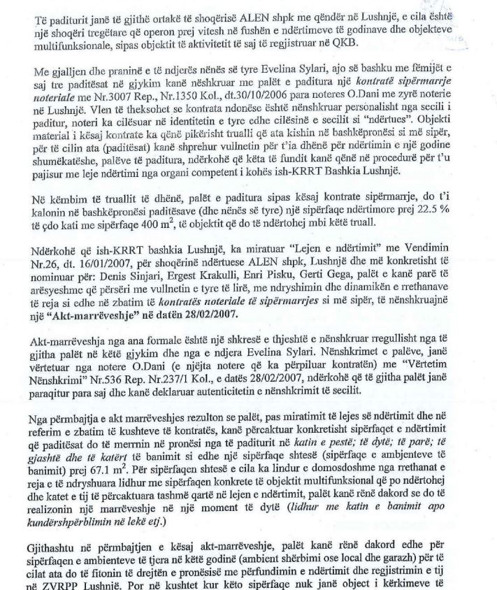 Në vitin 2007 familja Sylari në cilësinë e pronarit të truallit ka lidhur akt marrëveshjen me sipërmarrësin Ergest Krakulli etj, për ndërtimin e një objekti në të cilin pronarët e truallit do të përfitonin ambjente banimi në total 810 m2 në pasurinë nr.18/199, zona kadastrale 8571, lagjia Kongresi, qyteti Lushnjë.