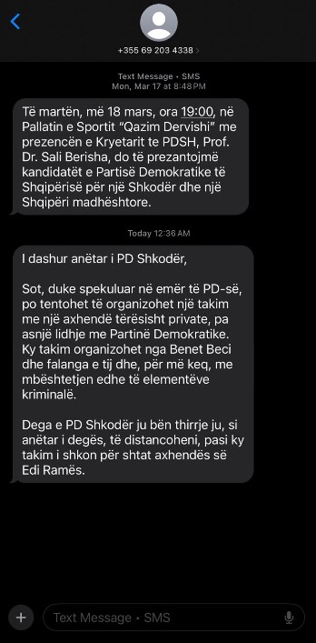 Dega e PD Shkodër ju bën thirrje ju, si anëtarë të degës, të distancoheni, pasi ky takim i shkon për shtat axhendës së Edi Ramës”.