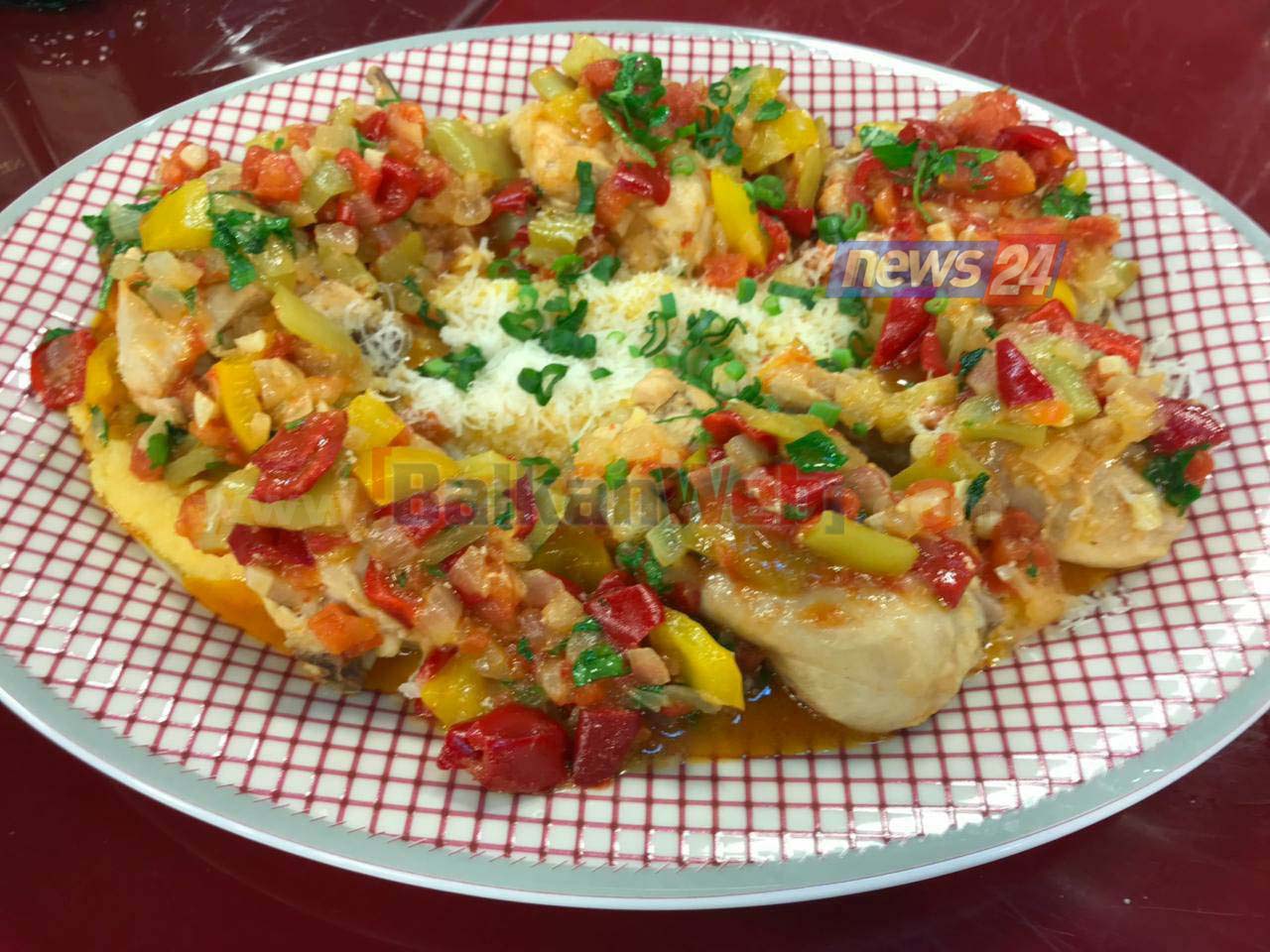 Servirim në pjatë polentën dhe e spërkasim me pak parmixhano duke vendosur në anë të saj mishin e pulës me salcën e gatuar. E spërkasim salcën me pak majdanoz, ndërsa polentën me pak bishta qepësh të njoma.