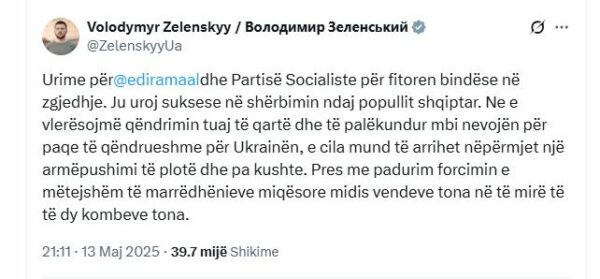 “Urime për @ediramaal dhe Partisë Socialiste për fitoren bindëse në zgjedhje. Ju uroj suksese në shërbimin ndaj popullit shqiptar. Ne e vlerësojmë qëndrimin tuaj të qartë dhe të palëkundur mbi nevojën për paqe të qëndrueshme për Ukrainën, e cila mund të arrihet nëpërmjet një armëpushimi të plotë dhe pa kushte.