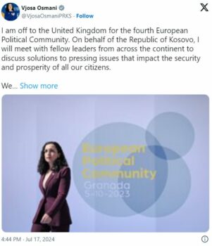 Përmes një postimi në X, që më herët njihej si Twitter, Osmani tha se në samitin e katërt të Bashkësisë Politike Evropiane do të takohet me udhëheqësit nga kontinenti për të diskutuar për “zgjidhjet për çështjet kryesore që ndikojnë në sigurinë dhe prosperitetin e të gjithë qytetarëve tanë”.