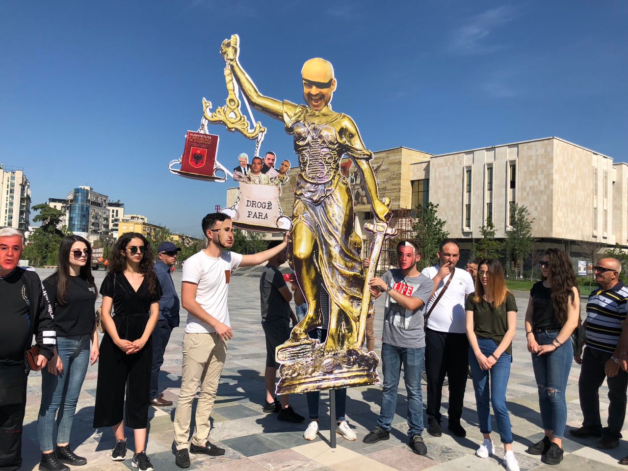Në Sheshin Skënderbej shfaqet statuja e Drejtësisë me portretin e Edi Ramës, që simbolizon kapjen politike të drejtësisë për t’i shërbyer krimit dhe korrupsionit. Statujën e Drejtësisë 3 metra të lartë e mbajnë 10 të rinj të maskuar si Edi Rama, Fatmir Xhafaj, Saimir Tahiri, Agron Xhafaj, Moisiu Habilaj për të treguar se Drejtësia është vënë në shërbim të trafikut të drogës, krimit të organizuar dhe qeverisë së lidhur me të.