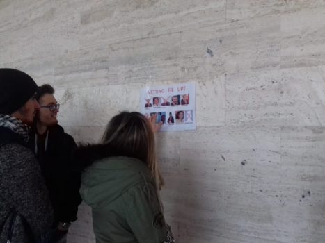 Studentët kërkojnë veting për këta pedagogë, të cilët në foto i kanë shënuar me kryq të kuq, sipas studentëve, këta pedagogë janë të korruptuar. Vetting për pedagogët është një kërkesë e cila është vënë re nga studentët gjatë ditëve të protestës para MASR. Krahas shumë pankartave që mbanin në duart, është vënë re edhe “Vetting për pedagogët”.