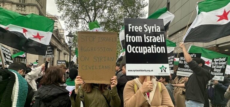 E organizuar nga Fushata e Solidaritetit Sirian, protesta tërhoqi një turmë të madhe që bënte thirrje për t’i dhënë fund asaj që ata e përshkruan si shkelje të sovranitetit sirian dhe ligjit ndërkombëtar.