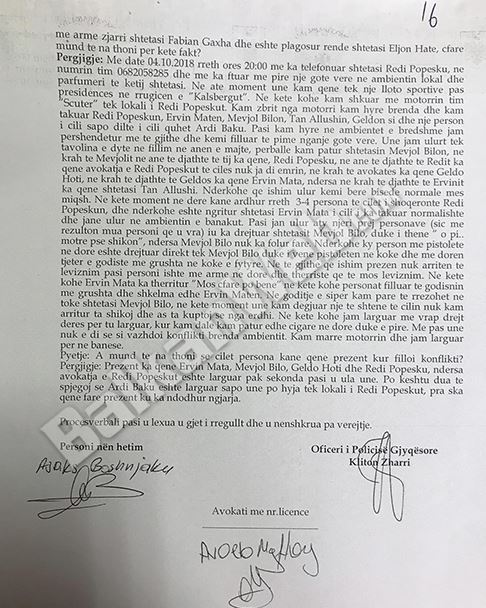 Ndërkohë ky personi me pistoletë në dorë është drejtuar tek Mevjol Bilo duke i vënë pistoletën në kokë dhe me dorën tjetër e godiste me grushta në kokë dhe në fytyrë. Ne të gjithë që ishim prezent nuk arritëm të lëviznim pasi personi ishte me armë në dorë dhe thërriste që të mos lëviznim. Në këtë kohë Ervin Mata ka thirrur “Mos çfarë po bën”, por personat filluan të godisnin më pas me grushte edhe Ervin Matën. Në goditje e sipër kam parë të rrezohet në tokë shtetasi Mevjol Bilo. Nuk arrita ta dalloj nga erdhi e shtëna me armë. Në këtë kohë kam ikur me vrap drejt derës për t’u larguar. Nuk e di më pas si vazhdoi konflikti në lokal. Kam marrë motorin dhe jam larguar në banesën time”- ka thënë Boshnjaku në dëshminë e tij.