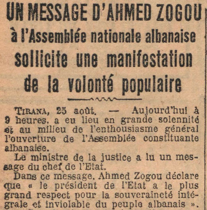 Gazeta franceze, “Le Journal”, ka botuar, të dielën e 26 gushtit 1928, në faqen n°3, mesazhin historik e patriotik të Ahmet Zogut drejtuar asokohe Asamblesë së parë kushtetuese shqiptare, të cilin Aurenc Bebja, nëpërmjet blogut të tij “Dars (Klos), Mat – Albania”, e ka sjellë në vijim për publikun shqiptar:
