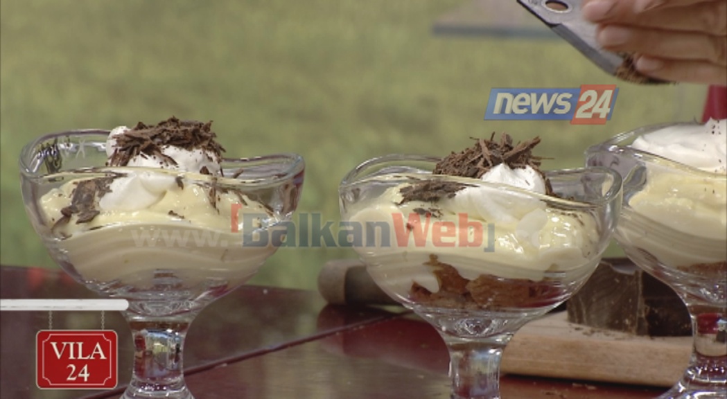 Në gotat ku do të servirim pudingun vendosim fillimisht një shtresë me biskota më pas një shtresë të hollë me puding. Fetat e bananes i vendosim tek pudingu, i trazojmë dhe vendosim përsëri një shtrësë puding me banane në gotat e servirjes. Në fund vendosim panën e ëmbëlsirës dhe e spërkasim pudingun me çokollatën e zezë.