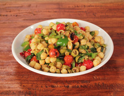 Fillimisht kullojmë dhe shpëlajmë qiqrat. Qepën e zhveshim dhe e grijmë atë imët së bashku me hudhrat. Karrotën e presim në feta rrumbullake së bashku me specat. Patatet i qërojmë dhe i presim në kubikë me brinjë 1.5 cm. Ngrohim vajin në një tenxhere kaurdisim qepën bashkë me hudhrat për 3 minuta duke shtuar më pas specat, karrotat dhe patatet. I kavardisim perimet për 3 minuta në temperaturë të lartë duke shtuar më pas specin djegës dhe erëzat e tjera. I përziejmë mirë të gjithë përbërësit, shtojmë më pas domatet e copëtuara të kutisë dhe lëngun e perimeve. Vendosim kapakun dhe e lemë gatimin të ziejë në temperaturë mesatare për 10 minuta. Pas 10 minutave shtojmë qiqrat dhe domatet qershi të prera në gjysma dhe e lemë gatimin të ziejë dhe për 5-10 minuta të tjera. E lemë pak të ajmakoset dhe e servirim të ngrohtë spërkatur me majdanoz të grirë imët dhe djath të bardhë të thërrmuar.