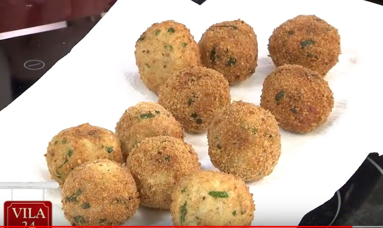 Vendosim në një tas peshkun dhe karkalecat e grira, pataten e zjerë dhe të grirë në rende, bukën të kulluar nga qumështi dhe të shtrydhur ire, majdanozin të grirë hollë, djathin parmixhano të grirë, arrë moskat, 1 kokërr vezë, kripë, piper të zi dhe piper të kuq. Të gjithë këta përbërës i përziejmë mirë dhe për të rregulluar kosistencën e brumit shtojmë 1-1 ½ lgj peksimadhe. Vazhdojmë përzierjen, më pas e mbulojmë tasin me një qese celefon dhe e vendosim në frigorifer për 30 minuta.