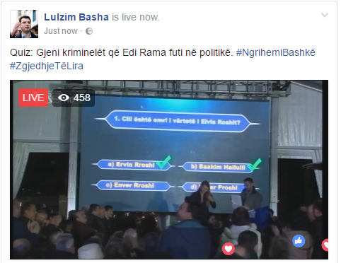 Një quiz dhe dhurata. Por quizi i veçantë flet për emrat e deputetëve dhe kryebashkiakëve si dhe akuzat e shumta të tyre si të lidhur me krimin. Në një ekran gjigant në podiumin e ngritur në çadër, shfaqet pyetja dhe opsionet që mund të zgjedhin protestuesit. Moderatorët e quiz-it, ish-zëdhënësja e PD, Oriela Nebiaj si dhe aktivisti i PD-së, Besart Kadia drejtojnë pyetjet dhe shpërndajnë dhuratat.