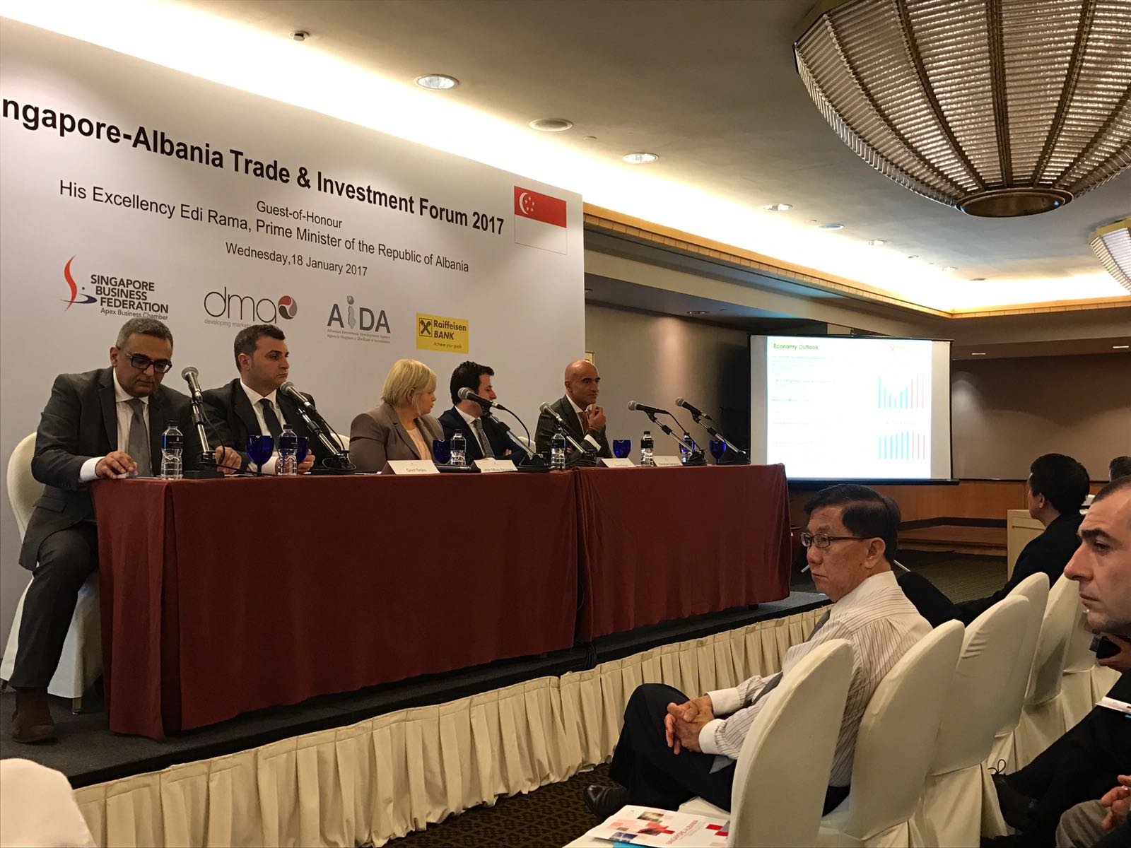 Në këtë kuadër, Forumin Shqiptar i Investimeve dhe Tregtisë në Singapor mblodhi përfaqësues të rëndësishëm të biznesit shqiptar dhe rreth 100 investitorë nga Singapori. Në këtë forum morën pjesë Kryeministri i Shqipërisë Z. Edi Rama, Ministrja e Zhvillimit Ekonomik, Turizmit, Tregëtisë dhe Sipërmarrjes, Znj. Milva Ekonomi, Ministri i Energjisë dhe Industrisë, Z. Damian Gjiknuri, Drejtori i Përgjithshem i Raiffeisen Bank, Z. Christian Canacaris, Guvernatori i Bankës së Shqipërise, Z. Gent Sejko, përfaqësues të bizneseve të rëndesishme në Shqipëri si dhe më shumë se 100 investitorë nga Singapori.