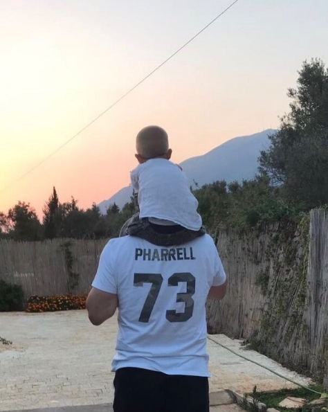 Kryeministri e mban të voglin Zaho mbi qafë, ndërsa të dy shijojnë perëndimin e diellit, të veshur me bluza të bardha dhe tuta të zeza.