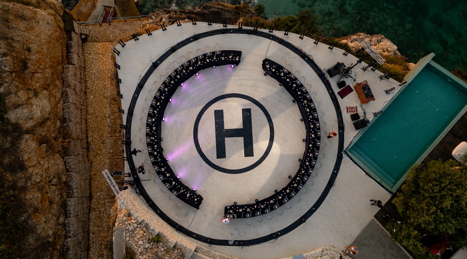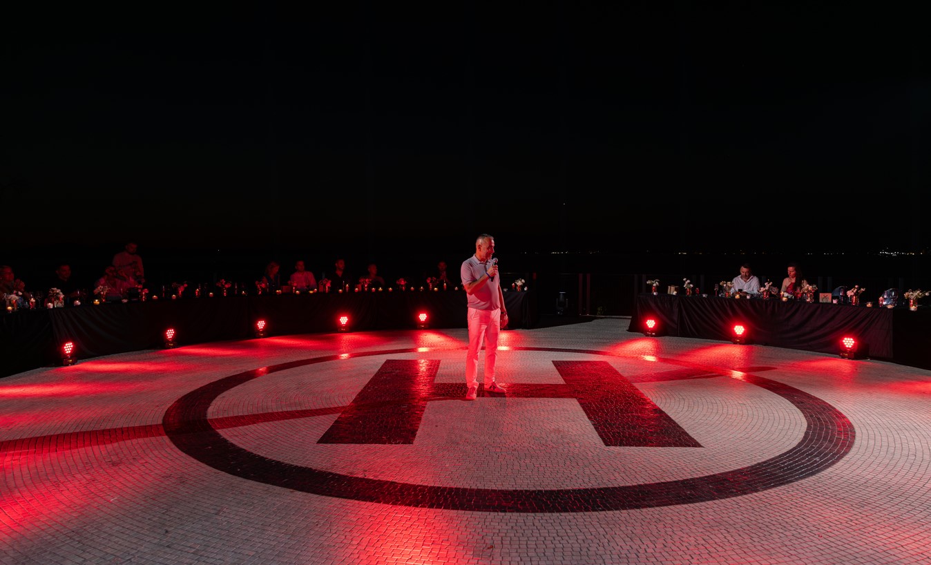 Kur dielli nisi të zbriste mbi det, gjithçka u kthye në spektakël. Pista e helikopterit në Marina Bay u shndërrua në një skenë gala. Tingujt e violinës së fuqishme të Olen Cesarit, i ftuari special i mbrëmjes, shoqëruan gotat që trokisnin dhe dritat që përthyeshin mbi valë. Arti, natyra dhe eleganca u shkrinë në një të vetme.