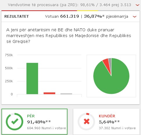 Nga 98,61% të vendvotime të numëruara rezulton se 91,48 % përqind e votuesve janë shprehur “pro” pyetjes “a jeni për anëtarësim në BE dhe NATO me pranimin e marrëveshjes së Republikës së Maqedonisë dhe Republikës së Greqisë”. Ndërkohë 5,64%  janë shprehur kundër marreveshjes, sipas Komisionit shtetëror të Zgjedhjeve.