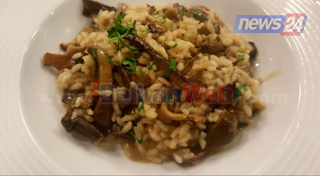 Në një tigan tjetër vendosim pak vaj ulliri dhe kaurdisim qepën të grirë shumë hollë derisa të zbutet. Më pas shtojmë orizin dhe vazhdojmë kaurdisjen e orizit mirë. E shuajmë më pas me verë të bardhë dhe sapo vera të avullojë shtojmë lëngun e perimeve pak nga pak duke e lenë gradualisht orizin të përthithë lëngun e perimeve. Ky proces zgjat 18-20 minuta dhe më pas e servirim orizin së bashku me kërpudhat e gatuara pudrosur në fund me djath parmixhano dhe majdanoz.