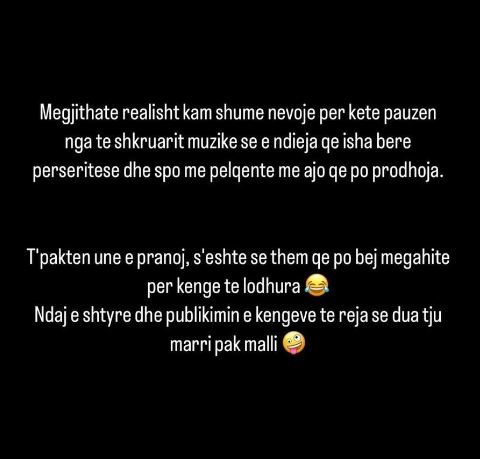 Megjithatë realisht kam shumë nevojë për këtë pauzën nga të shkruarit muzikë se e ndieja që isha bërë përsëritëse dhe s’po më pëlqente më ajo që po prodhoja. Të paktën unë e pranoj, s’është se them që po bëj megahite për këngë të lodhura. Ndaj e shtyva dhe publikimin e këngëve të reja se dua t’ju marrë pak malli. Në fund, ajo ka ndarë edhe një foto nga kënga e re që mezi pret ta nxjerrë.