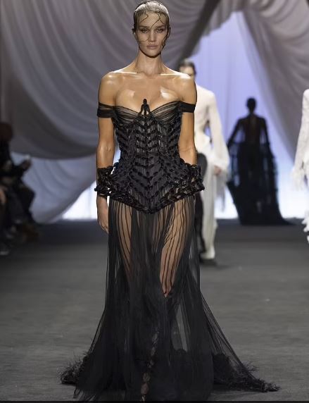 Supermodelja 37-vjeçare shkëlqeu me një fustan të tejdukshëm prej tyli të zi, me një korse, krijuar nga Ludovic de Saint Sernin.