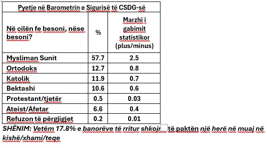 Në Barometrin e Sigurisë të CSDG-së (që u bazua në vrojtimin rigoroz statistikor që drejtova unë në gjithë territorin e Shqipërisë në periudhën 6-15 prill), kishte edhe një pyetje rreth besimit fetar, konkretisht “Në cilën fe besoni, nëse besoni?”. Dhe kësaj pyetje vetëm 0.2% e të anketuarve preferuan të mos i përgjigjen. Kështu që ky barometër na jep një tablo të plotë statistikore për besimet fetare të popullsisë së rritur të vendit.