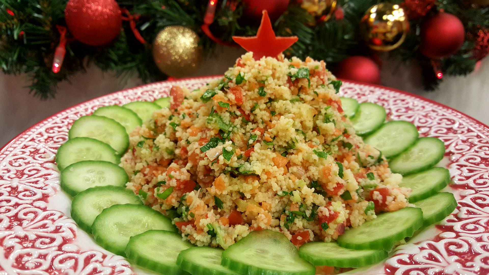 Fillimisht shtojmë tek tasi me kuskus 1 filxhan çaji me ujë të vluar, e mbulojmë dhe e lemë të pushojë.Të gjitha perimet i grijmë shumë imët me dorë ose me grirësen e qepës apo dhe me rende. Domaten e pastrojmë nga farat dhe e presim në kubikë sa më të vegjël. Përziejmë perimet së bashku me majdanozin të grirë shumë imët. I shtojmë perimeve pak kripë dhe i trazojmë përsëri. Shtojmë në fund kuskusin e gatuar dhe të ftohur, I trazojmë së bashku duke shtuar në fund dresingun e përgatitur me lëng limoni, uthull dhe vaj ulliri. E shërbejmë sallatën duke i dhënë formën që dëshirojmë.