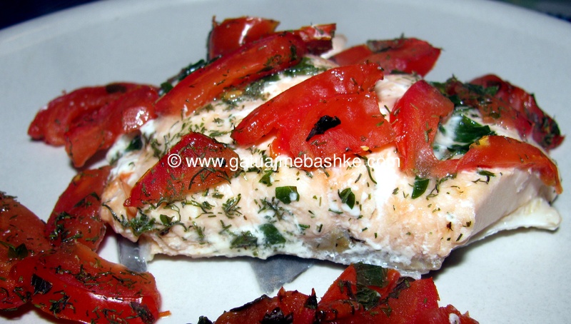 Ndërkohë peshkun e vendosim në një letër pjekje, e lyejmë peshkun me një sasi të vogël mustarde dhe mbi të vendosim peksimadhen me erëzat. E vendosim peshkun në furrë në temperaturën 180 gradë Celsius për 15 minuta për t’u granituar më pas e shërbejmë me perime.