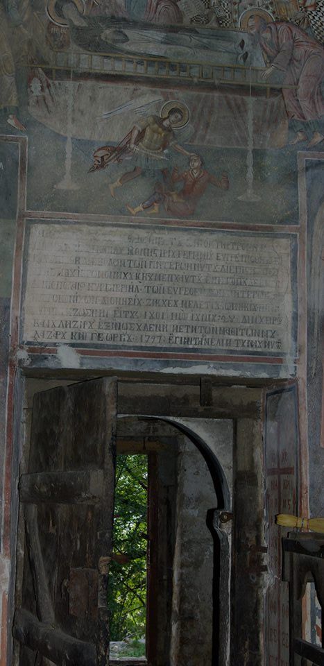“Ky tempull i gjithnderuar dhe hyjnor i atit tonë ndër shenjtorë Shën Thanasit të madh i Manastirit të Gjermanonit u stolis dhe u zbukurua me shpenzimet e etërve të tij, me mbikqyrjen e Krisanthit jeromonakut dhe igumenti të tij. Në kohën e peshkopit tonë të Drinopojës Kir Gabriel të etërve present dhe jeromonak të Dhionisit, Zakehut, Meletit, Joaniqit, Papa Qirjaqi dhe Zosima, me 1801 muaji qershor 28. Me dorën time të Llazarit nga Ano Sudhena së bashku me nxënësit e mi Lazarin dhe Gjergjin. Më 1797 u bënë themelet e këtij tempulli.”