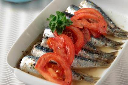 Lyejmë një tavë me vaj dhe shtrojmë në të 1/3 e sasisë që kemi në tas. Vendosim sardelet me kurriz nga poshtë duke i hapur ato si fletët e një libri, i spërkasim përsëri në ½ e domateve të mbetura duke i mbuluar në pjesën tjetër të sardeleve këtë rradhë me kurrizin nga lart. I spërkasim përsëri me domatet e mbetura duke i shtuar në fund lëngun e ½ limoni. Në fund i pudrosim me pak peksimadhe dhe i vendosim në furrë në temperaturën 180 gradë për 40 minuta.