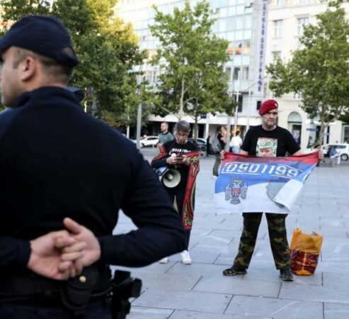 Në podiumin e statujës së princit Mihailo qëndruan aktiviste duke mbajtur numrin 8372, si kujtesë për numrin e viktimave të vrara në gjenocid.