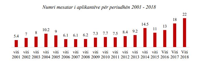 “Numri mesatar i kandidatëve për një pozicion për vitin 2018 llogaritet të jetë 22. Siç mund të vihet re nga grafiku i mëposhtëm, numri mesatar i aplikantëve për pozicion ka pësuar rritje në krahasim me vitet e mëparshme, gjë që tregon për një interesim në rritje për t’u bërë pjesë e shërbimit civil” thuhet në raport.