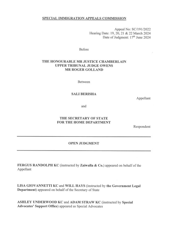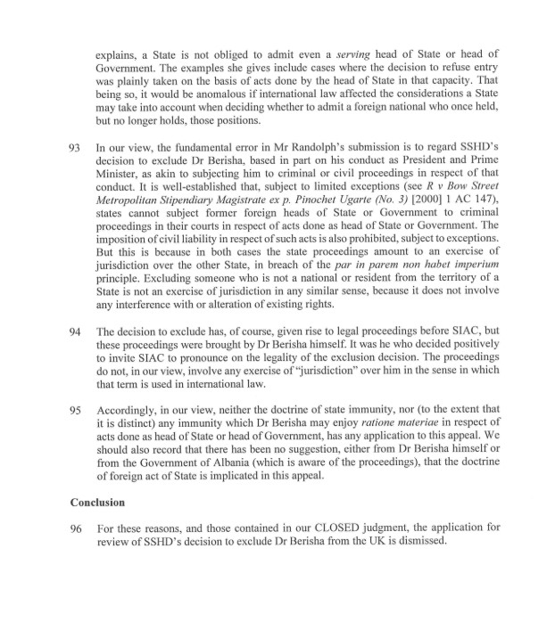 Ai apeloi kundër vendimit në Komisionin Special të Apelimit të Emigracionit (SIAC) në Londër në mars, duke argumentuar se u ndalua nga MB në bazë të pohimeve të rreme të paprovuara. SIAC hodhi poshtë sfidën e Berishës në një vendim me shkrim këtë të hënë. Vendimi i Britanisë për të ndaluar Berishën nga vendi erdhi një vit pasi ai u shpall non grata nga Shtetet e Bashkuara për korrupsion të dyshuar dhe abuzim me pushtetin.