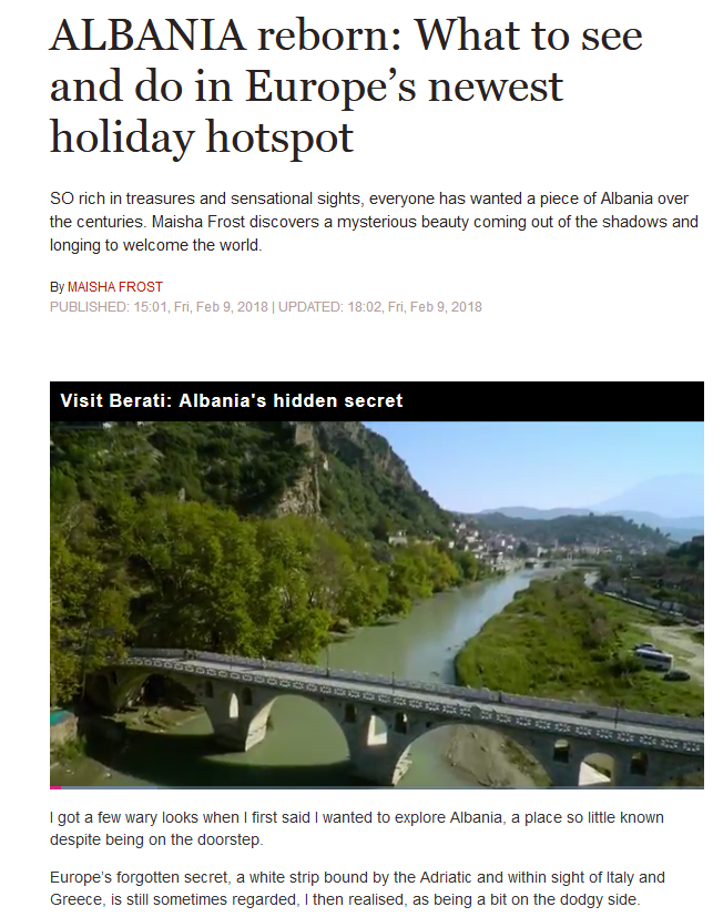Aq e pasur në pika turistike dhe pasuri natyrore, çdokush do të donte të shihte një pjesë të Shqipërisë. Kështu e nis artikullin, Maisha Frost për prestigjiozen britanike Express.co.uk. Autorja e cilëson Shqipërinë si ‘bukuri misterioze e dalë nga hijet e dikurshme, e cila më në fund po përshëndet botën”.
