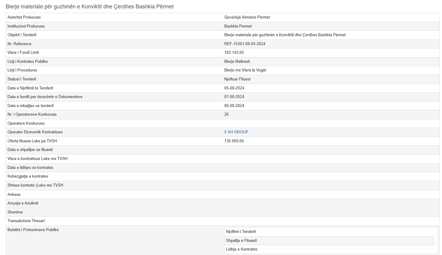 Tenderi i hapur në datën 05.08.2024 me REF-15301-08-05-2024 është shpallur fituese firma 5 XH GROUP. Tenderi u hap me fond limit 183,143,00 lekë. Ndërsa më tej një tjetër tender është hapur për BLERJE USHQIME PËR KOPSHTIN ME DREKË, ÇERDHEN DHE KONVIKTIN NË BASHKINË PËRMET PËR VITIN 2024.