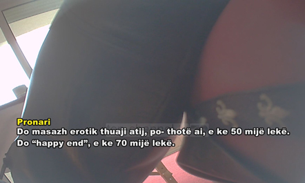 Pronari -Pikërisht. Do masazh erotik thuaji atij, po, e ke 50 mijë lekë. Do “happy end”, e ke 70 mijë lekë. Ky është çmimi i të dyve ne. E do “happy end” ai… gojore, se po flasim hapur, një gojore është 70. Ta prekësh, ta eksitosh pak a shumë. E kam vendos tani këtë, krijon njëçikë atmosferë.