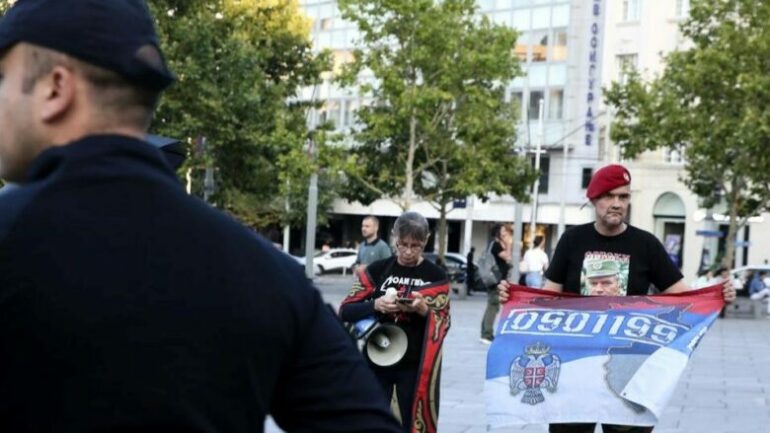 Njëri prej tyre kishte veshur një këmishë me fotografinë e Ratko Mladiqit dhe valëviste flamur të Republikës Serbe. U kujtua se shpallja e njëanshme e Republikës Serbe ishte hyrje në luftën e Bosnjës dhe u shpall jo kushtetuese.