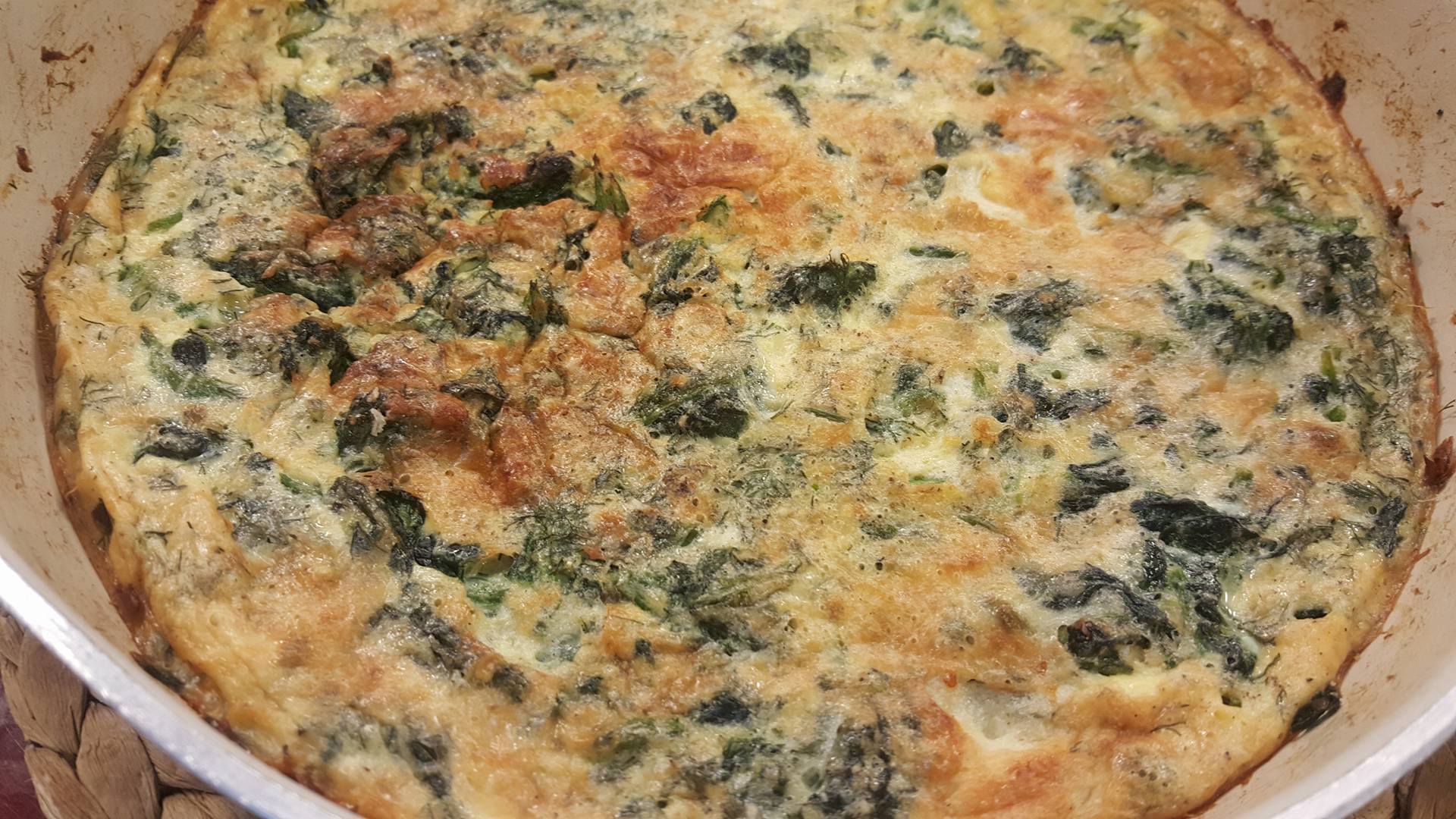 Lajmë spinaqin dhe e kalojmë në ujë të vluar me kripë për 2 minuta. Më pas e kalojmë në ujë të ftohtë me akull, e shtrydhim mirë dhe e presim vrazhdë. Ndërkohë në një tigan me vaj kaurdisim qepët të prera në kubikë derisa ato të zbuten ( i ndihmojmë duke i hedhur pak ujë herë pas here me qëllim që qepa të mos ngjyroset). Shtojmë më pas kripë, piper të zi, arrë moskat, koper dhe spinaqin dhe e lemë në zjarr derisa ai të ulë volumin. Lyejmë tavën me gjalpë, e pudrosim atë me peksimadhe, vendosim spinaqin dhe e nivelojmë mirë. Rrahim 4 kokrra vezë me qumësht dhe pak miell, i përziejmë mirë derisa të formohet një masë homogjene. Shtojmë dhe pak kripë dhe arrë moskat dhe e vendosim kremin mbi spinaq duke vendosur pak gjalpë mbi të dhe duke e pudrosur me djath kaçkavall të grirë. E vendosim tavën në furrë në temperaturën 180 gradë Celsius për 15 minuta derisa të mpikset dhe të marrë një ngjyrë të verdhë.