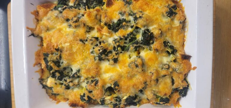 3. Përgatitja e bukës: Pritni fetat e bukës në kubikë të vegjël dhe shtojini në përzierjen e spinaqit dhe vezëve.