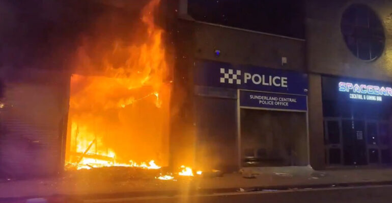 Stacioni i policisë në Sunderland në Waterloo Place u plaçkit dhe u dogj. Policia që merret me trazirat në Sunderland po përballet me “abuzime të rënda”, ka thënë Policia e Northumbria. “Skenat që po shohim janë krejtësisht të papranueshme dhe nuk do të tolerohen. Garantimi i sigurisë së publikut është prioriteti ynë më i lartë”, thanë autoritetet, ndërsa sekretarja britanike e Brendshme Yvette Cooper theksoi se kriminelët që shkaktojnë telashe në Sunderland do të paguajnë, duke vënë në dukje se policia kishte mbështetjen e qeverisë për të marrë masat më të forta të mundshme.