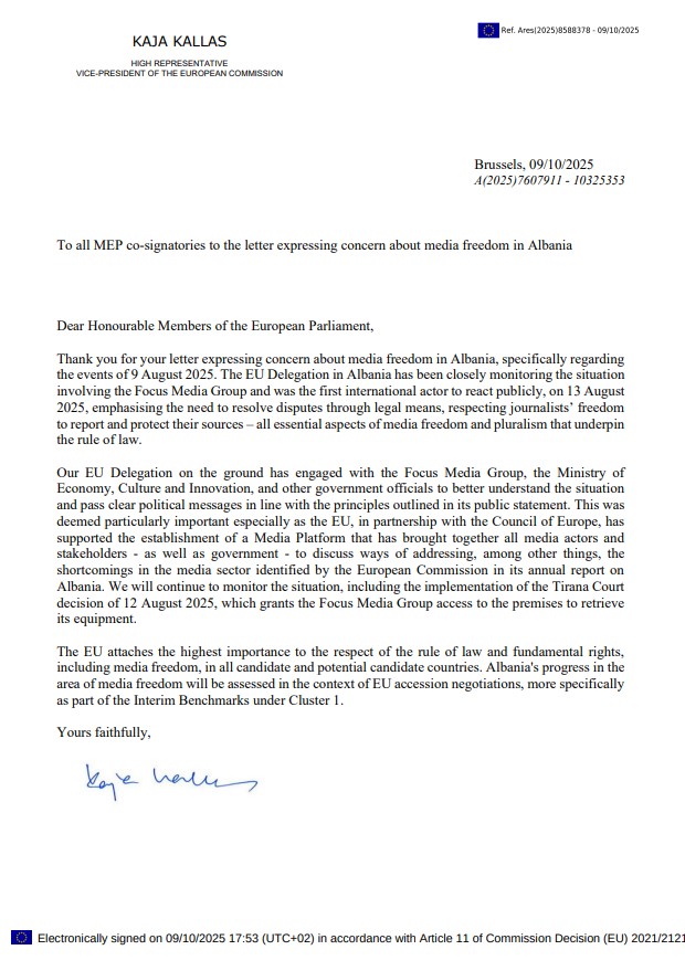 “Delegacioni i BE-së në Shqipëri ka ndjekur nga afër situatën që përfshin Focus Media Group dhe ishte aktori i parë ndërkombëtar që reagoi publikisht më 13 gusht 2025, duke theksuar nevojën për të zgjidhur mosmarrëveshjet në rrugë ligjore, duke respektuar lirinë e gazetarëve për të raportuar dhe mbrojtur burimet e tyre – të gjitha këto janë aspekte thelbësore të lirisë së medias dhe pluralizmit që mbështesin sundimin e ligjit”, sqarohet në letrën e Kallas.