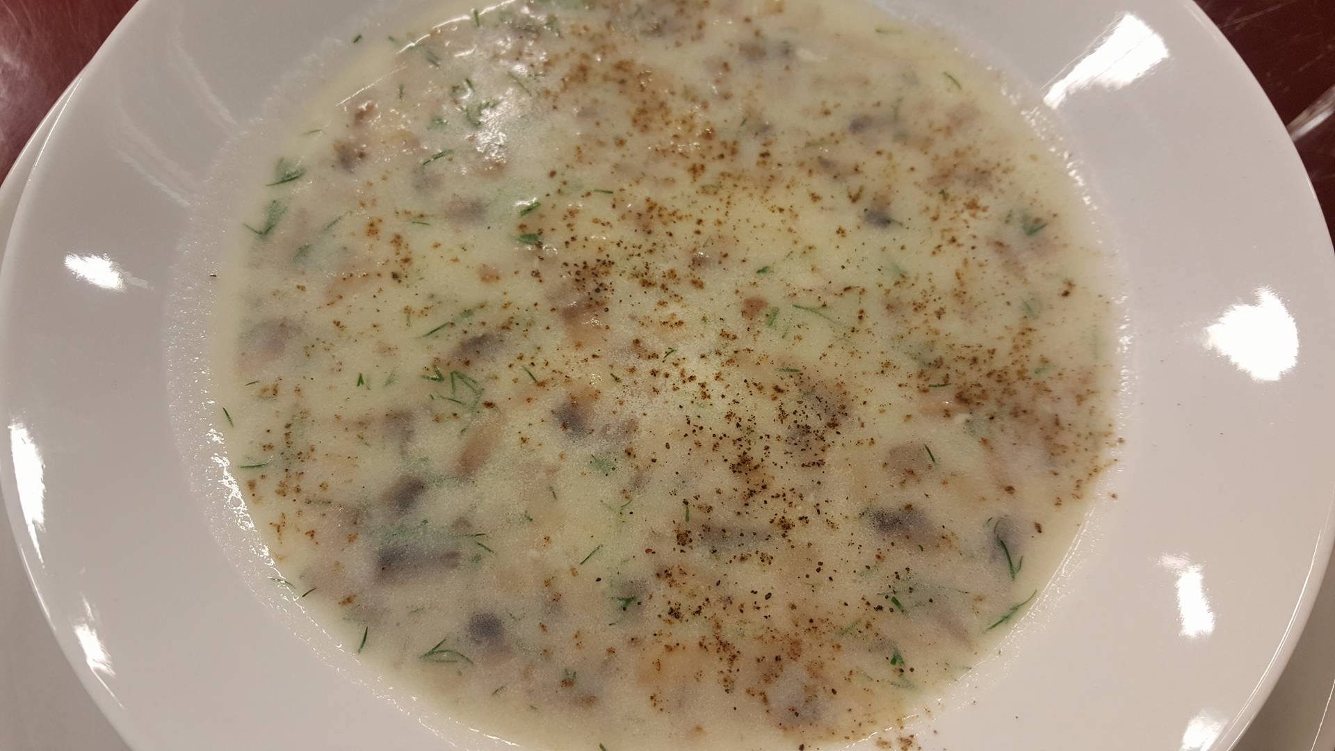 Presim kërpudhat në kubikë 0.5 cm dhe i skuqim në një tigan me pak gjalpë dhe më pas i shtojmë tek supa së bashku me 2 lugë djath parmixhano të grirë hollë. E lemë supën të marrë valë për pak minuta dhe më pas e shërbejmë të ngrohtë pudrosur me koper.