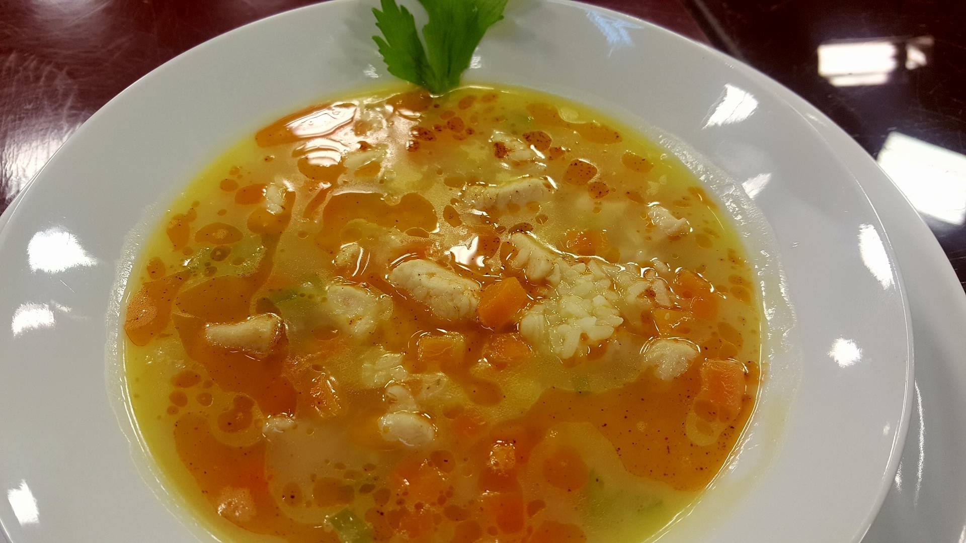 Lajmë thajmë mishin e pulës dhe e vendosim në tenxhere me 1 litër ujë dhe e lemë të ziejë për 30 minuta. Ndërkohë në një tenxhere tjetër kaurdisim qepën të grirë shumë imët, sapo qepa të zbutet shtojmë në të karrotën të prerë në kubikë të vegjël, selinonë po ashtu të prerë në copëza të vogla dhe orizin dhe i kaurdisim të gjithë përbërësit së bashku për 2 minuta. Më pas shtojmë lëngun e pulës dhe mishin e copëtuar me dorë (nëse është fileto e presim në kubikë të vegjël) dhe e lemë supën të ziejë për 15 minuta. Më pas e fikim sobën dhe e lemë tenxheren në nxehtësinë e saj për 10 minuta të ajkoset. Ndërkohë shkrijmë 1 lugë gjalpe duke e trazuar me 1 lugë kafeje piper të kuq dhe spërkasim supën në çdo pjatë gjatë servirjes.