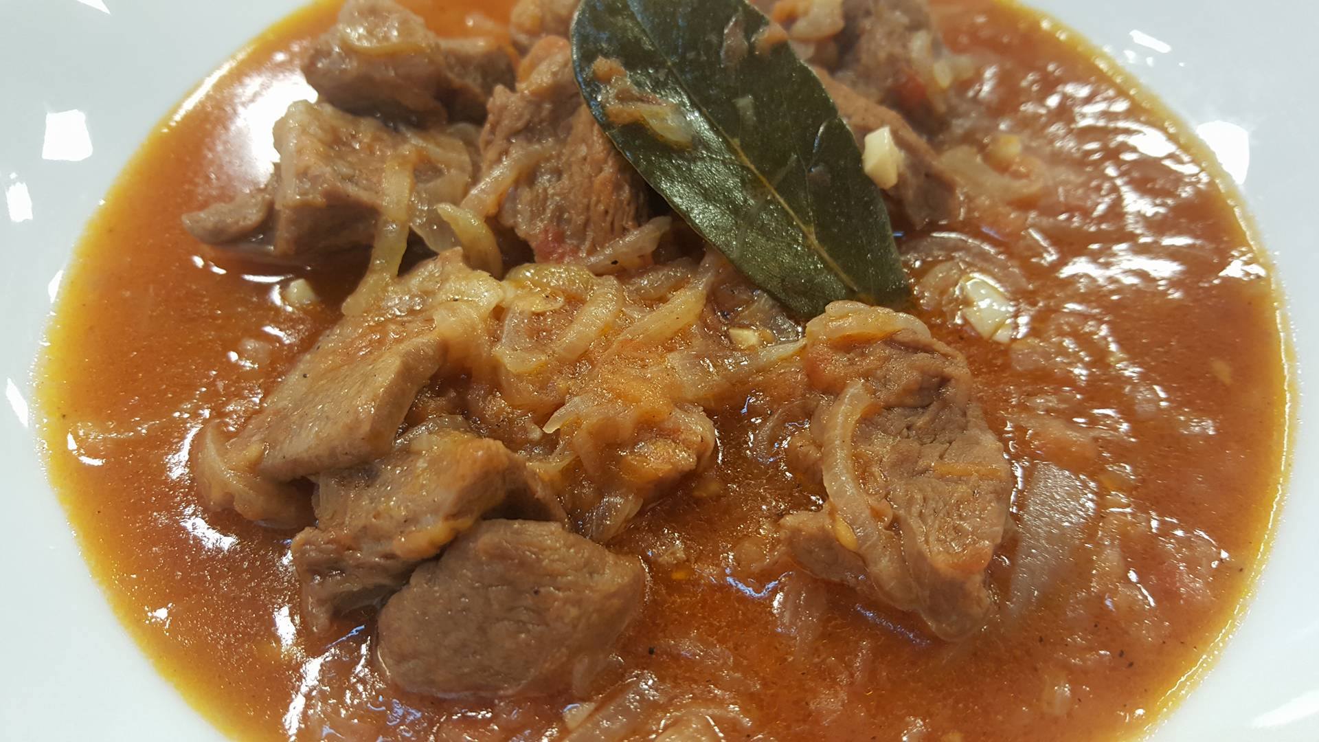 Fillimisht lajmë mishin e thajmë dhe e presim në kubikë të vegjël. Qepët i presim hollë në kubikë ose në feta të holla. Vendosim në tenxhere vajin dhe sapo ai të ngrohet fillimisht vendosim mishin dhe e kaurdisim sa të përthithë lëngun e tij. Më pas shtojmë qepët dhe hudhrat dhe vazhdojmë kaurdisjen së bashku derisa mishi dhe qepa të marrin pak ngjyrë të verdhë të theksuar. E pudrosim me pak miell dhe e përziejmë pak duke e shuar me verë. Shtojmë më pas salcën dhe domatet e grira në rende dhe një gjethe dafine. Vendosim kapakun dhe e lemë gatimin të ziejë 10 minuta në temperaturë mesatare. E rregullojmë me kripë dhe piper të zi, shtojmë pak ujë të ngrohtë sa të mbulohet mishi dhe e lemë përsëri të ziejë në temperature mesatare derisa piruni të ngulet lehtë në mish.