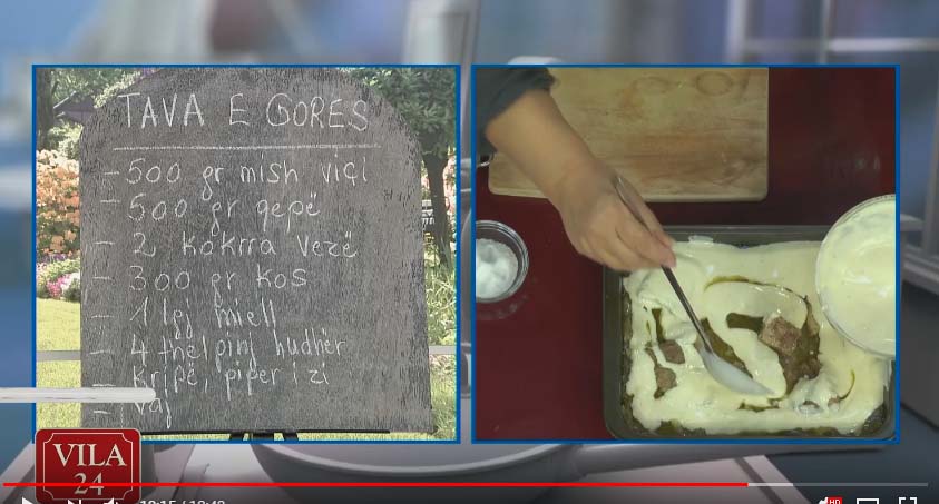Në një tas rrahim vezët me kosin dhe me 1 lugë miell. E trazojmë sa të na formohet një krem homogjen dhe më pas mbulojmë me krem përbërësit në tavë dhe e vendosim në furrë në temperaturën 180 gradë Celsius për 25-30 minuta.