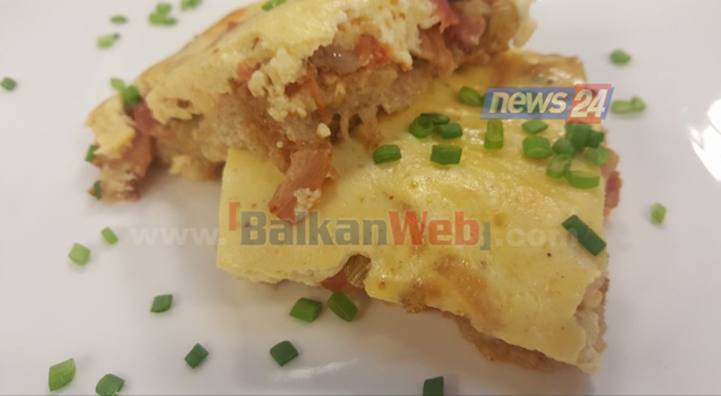 Vendosim 3 lugë vaj ulliri në një tigan, shtojmë në të pançetën të prerë në kubikë të vegjël, e kaurdisim atë duke shtuar më pas qepët të prera në unaza të holla, i skuqim pak për 3-4 minuta dhe i rregullojmë me kripë dhe piper të zi. Më pas shtojmë domatet të qëruara nga lëkura dhe të prerë tulin në kubikë. I trazojmë të gjithë përbërësit për 5 minuta dhe më pas me këtë salcë me perime dhe pançetë mbulojmë fetat e bukës.