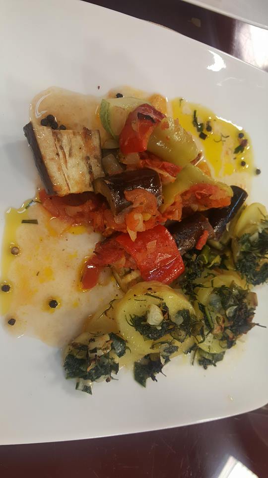Në një tigan tjetër me pak vaj ulliri kaurdisim qepët e njoma së bashku me hudhrat e njoma të grira gjithashtu imët. I lemë derisa qepët e njoma të ulin volumin dhe më pas shtojmë majdanoz, koper, kripë dhe piper të zi. Salcën e kuqe të domateve e shtojmë në tavë mbi perimet, ndërsa salcën jeshile me qepët e njoma e vendosim mbi patatet. Shtojmë në fund një gotë ujë të ngrohtë në tavë, e pudrosim sipërfaqen me pak piper të zi dhe e vendosim tavën me perime në furrën e parangrohur në temperaturën 180-200 gradë Celsius për 40 minuta.