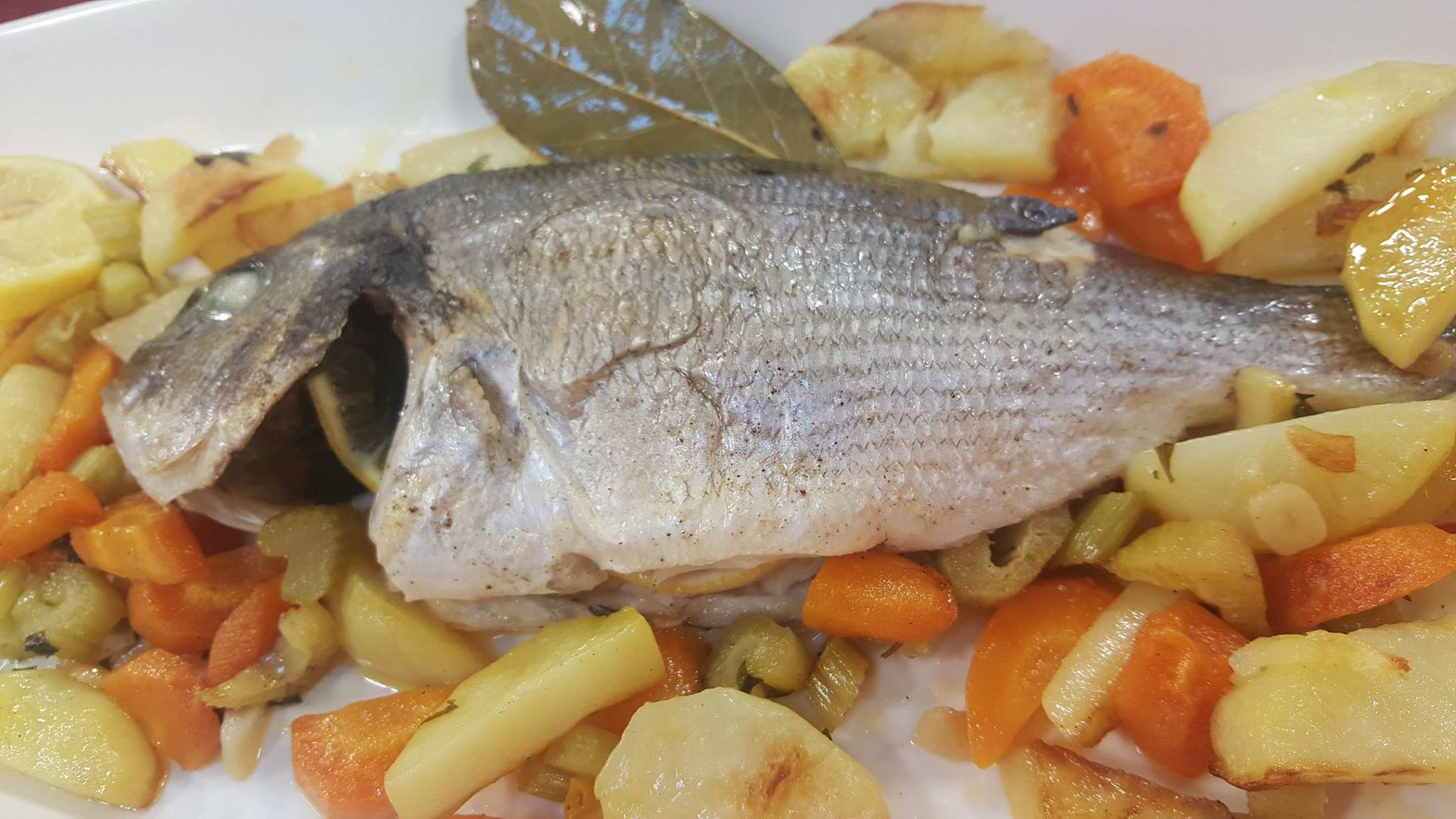 Fillimisht marinojmë peshkun me lëng limoni, kripë dhe piper të zi. I bëjmë më pas peshkut 2 prerje të holla në shpinë nga të dy anët. Hapim barkun e tij dhe brenda vendosim një thelpi hudhër prerë në feta, dy gjysëm feta limoni dhe një degë majdanoz. Patatet e qëruara i presim në feta ose në kubikë dhe i vendosim në ujë të vluar me kripë për 3 minuta dhe pasi ti lyejmë me vaj ulliri dhe kripë i vendosim në furrë në temperaturën 180 gradë Celsius për 20 minuta. Ndërkohë presim karrotat dhe selinonë në feta. Në një tigan me pak vaj copëtojmë pak spec djegës dhe shtojmë perimet të cilat i kaurdisim për 10 minuta duke shtuar dhe 2 thelpinj hudhër, majdanoz të grirë, kripë dhe piper të zi. Nxjerrim patatet nga furra, vendosim tek patatet 2 gjethe dafine dhe perimet që kaurdisëm në tigan. Vendosim më pas peshkun midis patateve, e spërkasim me lëng limoni dhe ½ e sasisë së verës dhe e vendosim përsëri tavën në furrë në temperaturë 220 gradë Celsius për 10 minuta. Më pas shtojmë pjesën tjetër të verës dhe e lemë në furrë dhe për 8-10 minuta të tjera.
